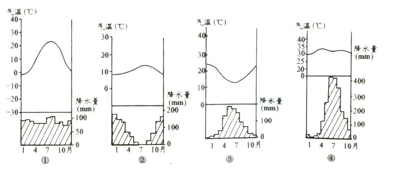 解析:本题虽没有直接设问气候类型,但解答问题必须准确判断出气候类型。按步骤可得①是北半球温带季风气候(日本西海岸,海洋性强,冬季雨雪多),②是北半球地中海气候,③是南半球地中海气候,④是北半球热带季风气候。