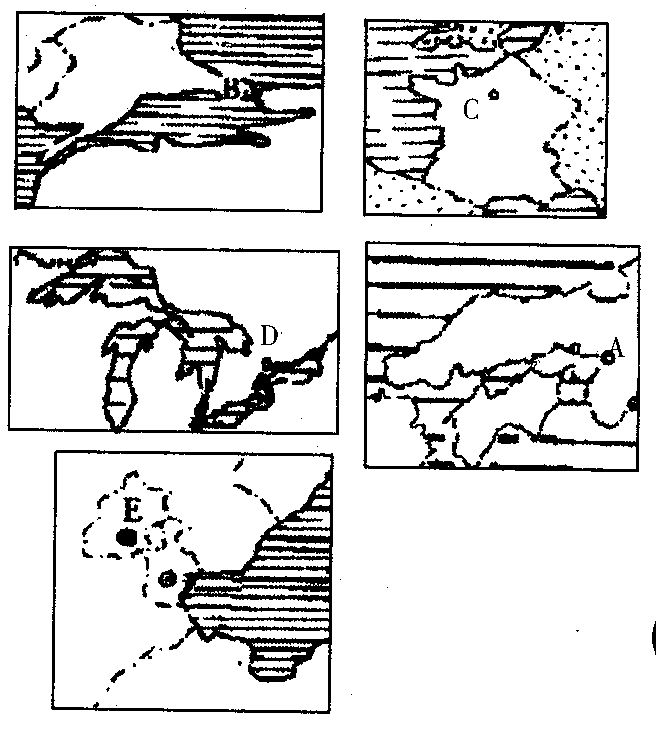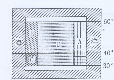 4、下图表示位于北纬30°—60°的大陆部分,