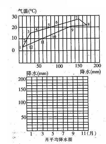 (1)用上图资料在下图中按比例绘出该地降水逐月分配柱状图。