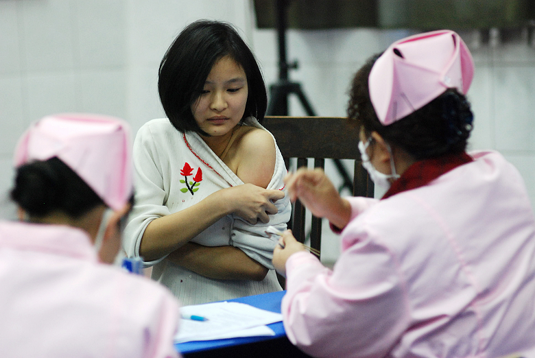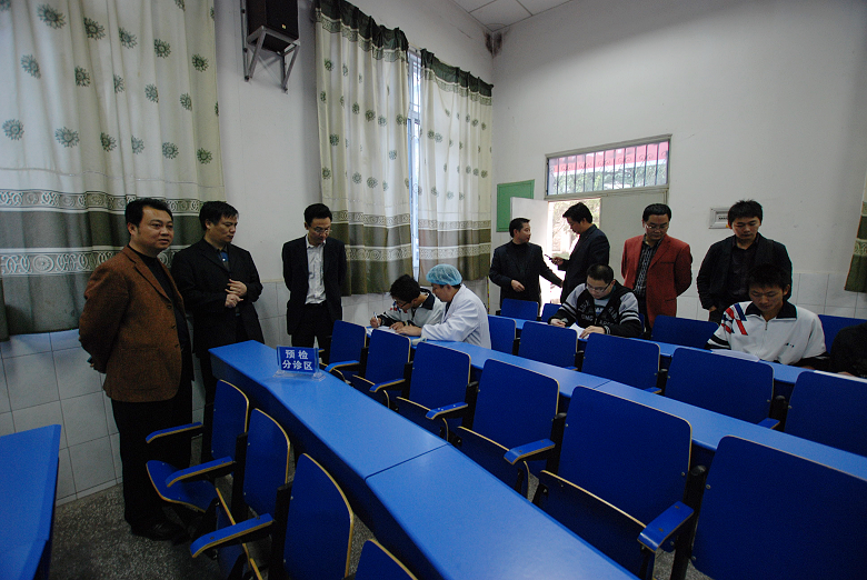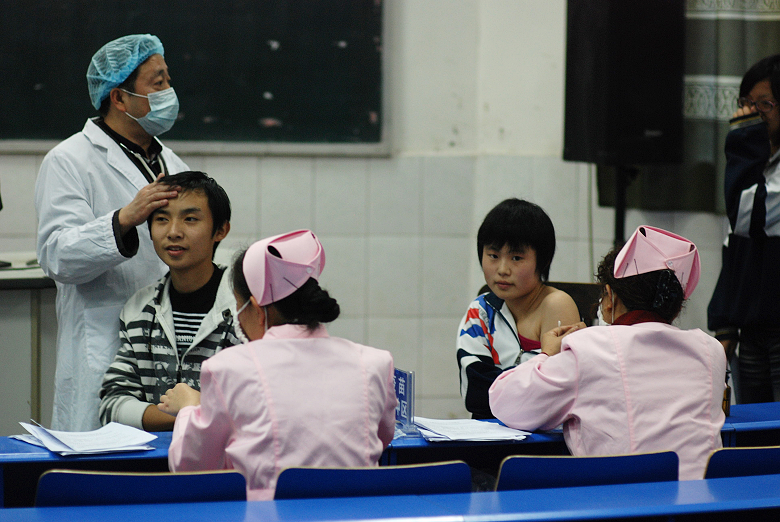 在仁寿一中阶梯教室里,原本的阶梯教室已被改为接种工作室,工作室分三步,第一步是体温测试,县疾控中心的医生正在对即将接种的学生进行体温检测。有没有感冒发烧,对鸡蛋、青霉素、花粉过不过敏,有咽痛、咳嗽等感冒症状的学生,都要被刷下来。接种甲流疫苗的程序是非常谨慎严格的。第二步,学生按要求填写提交申请书。第三步才是接种疫苗。