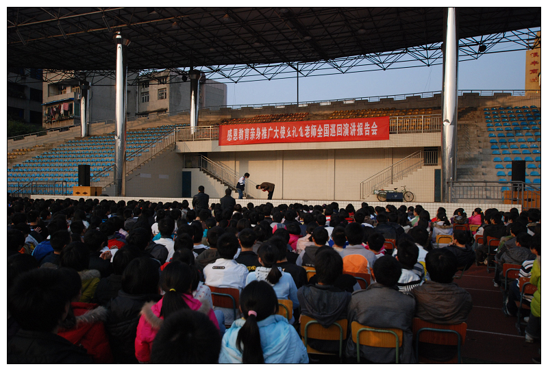 11月30日下午,著名感恩教育专家邱礼飞先生一行来到仁寿一中,我校高中部全体师生共四千多人在仁寿一中体育场聆听了邱先生的演讲。