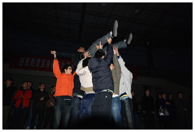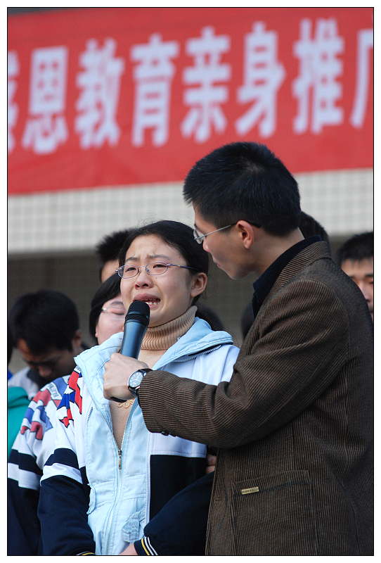 感恩教育亲身推广大使邱礼飞老师踏着音乐节拍精彩亮相,一下子吸引了同学们的目光,接着他以自己的亲身经历以及生活中的感恩故事等为素材娓娓道来,形象深情地阐释了感恩的理由,感恩的方式,感恩的意义。邱礼飞先生声情并茂的演讲伴以动人的旋律,加上不时的开展与学生的互动活动,让学生主动的、自发的、自愿的用自己的切身感受坦诚的、爆发般的表现出来,形成一个气场,让许多同学被感染得潸然泪下。当很多同学都激动不已,泪流满面的冲向台上高声呼:“爸爸、妈妈,我爱你们,永远永远!”“老师,我爱您!”“我再也不会进网吧了……”是悔恨还是感动,或是心灵受到猛烈震动而如梦初醒。一声声感人肺腑的呐喊,激发了学生的感恩之情,让爱走进了我们的生活,走进了我们的校园,走进了我们的心灵深处......