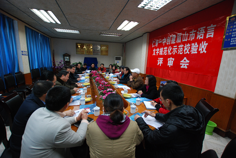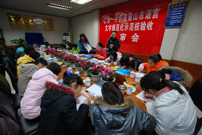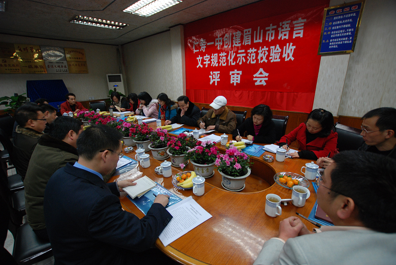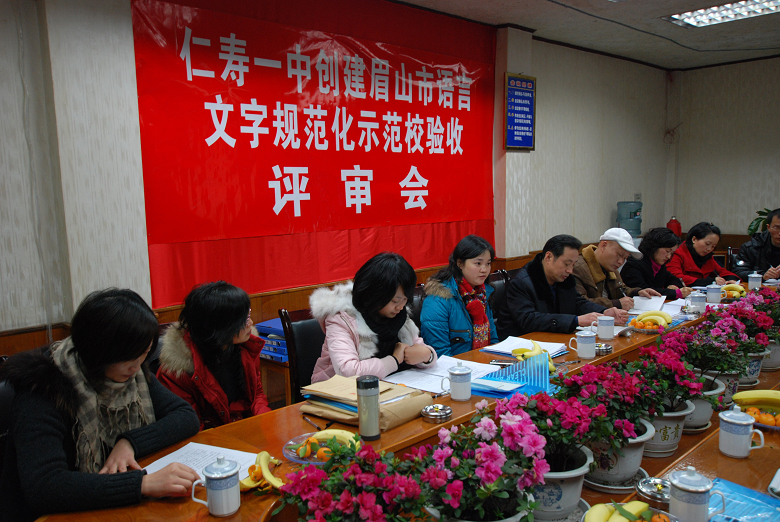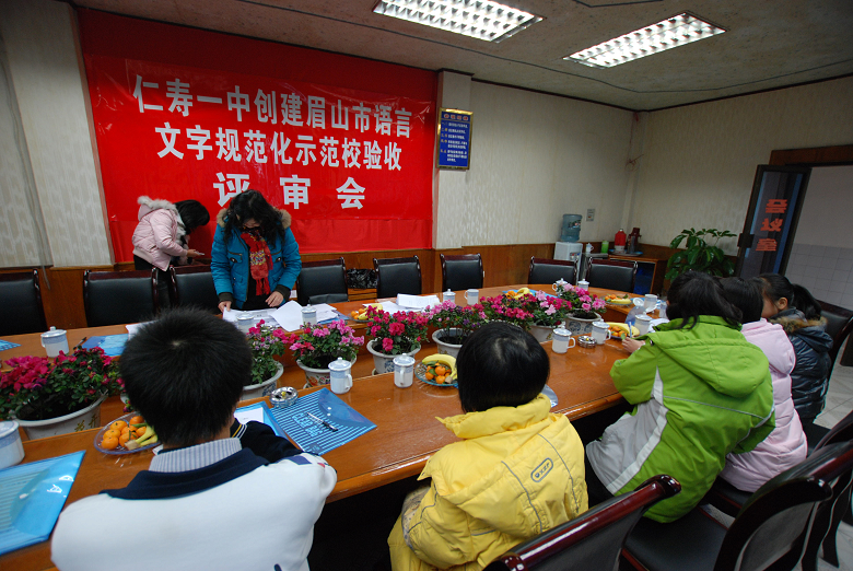 首先检查组听取了仁寿一中校长方良元的工作汇报,方校长就近几年来仁寿一中语言文字规范化工作进行了总结:仁寿一中为语言文字规范化制定了健全的制度,使开展开展语言文字规范化工作有了保障;二是提高师生认识,从法规高度落实语言文字工作;三是要求语言文字规范化融入教师的教育、教学中,师生人人说普通话,写规范字;四是重视普通话的培训和考核努力按要求达标。