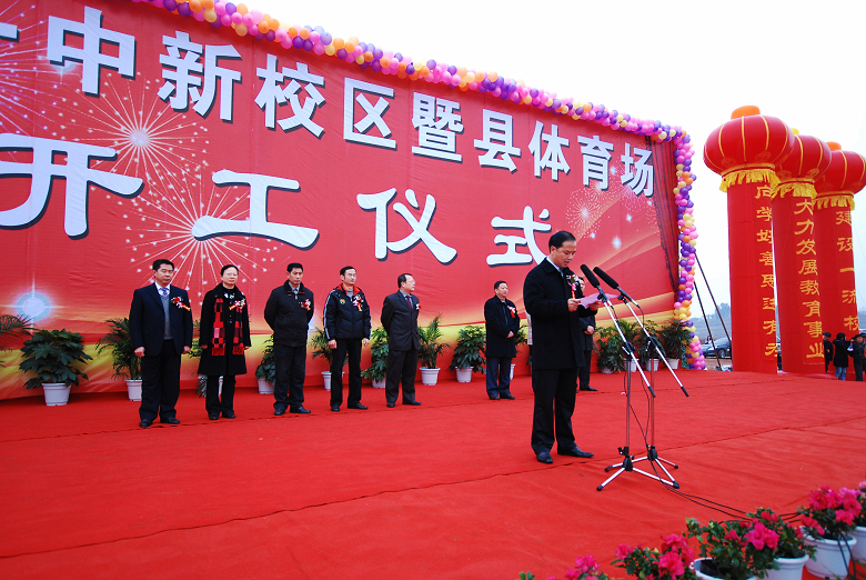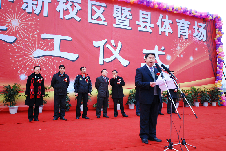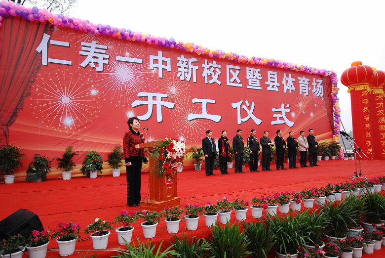 中共眉山市委常委、市委秘书长王影聪宣布仁寿一中新校区暨仁寿县体育场奠基开工。在隆隆的礼炮声中,到会的市、县领导为工程成功的开工进行了奠基。