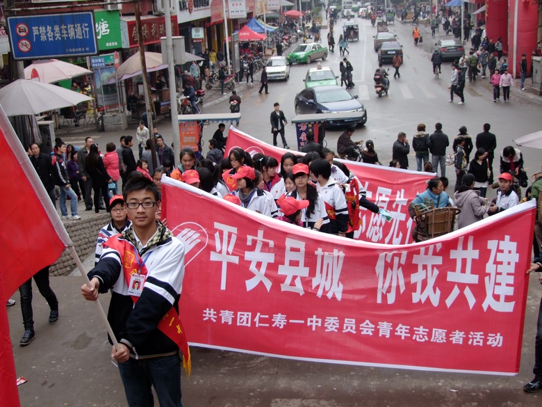 此次志愿者活动宣传的主题是“平安县城,你我共建”。志愿者们在天仁公园分散开去向群众宣传活动主旨,并号召大家一起创建平安县城,许多老人与小孩也都积极参与,所有参与的群众都在宣传横幅上签字,部分群众还写上了祝福的话语。