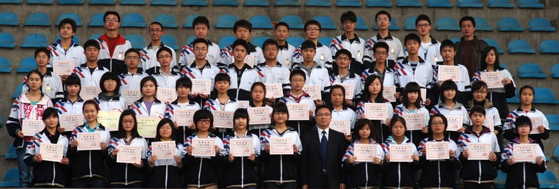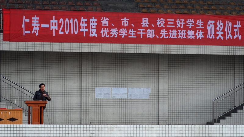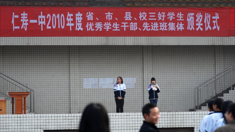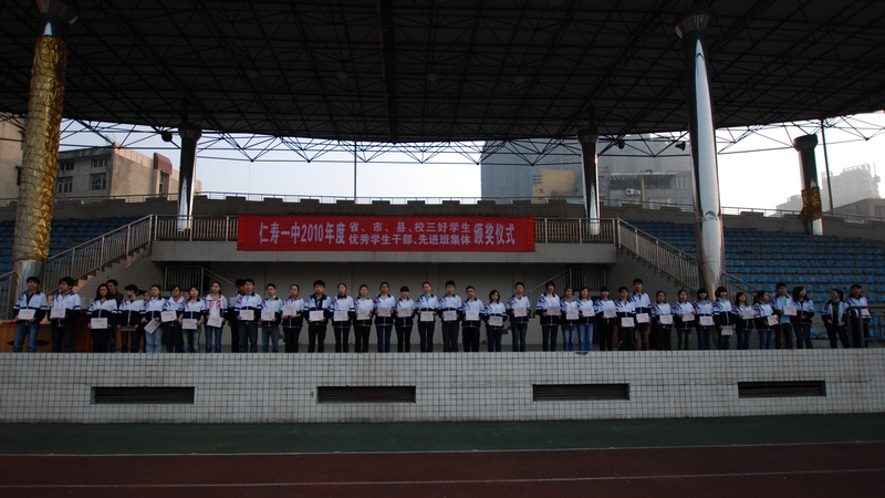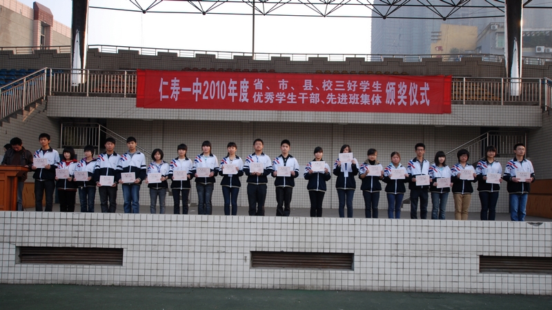 4月11日早晨升旗仪式后,仁寿一中在体育场举行了2010年度省市县校三好学生、优秀学生干部、先进班集体颁奖仪式。仪式由政教处主任高亚敏主持,杨建清副校长、年级主任政教处副主任代建等上台为获奖学生分别颁发了奖状、证书、证章以及奖金。