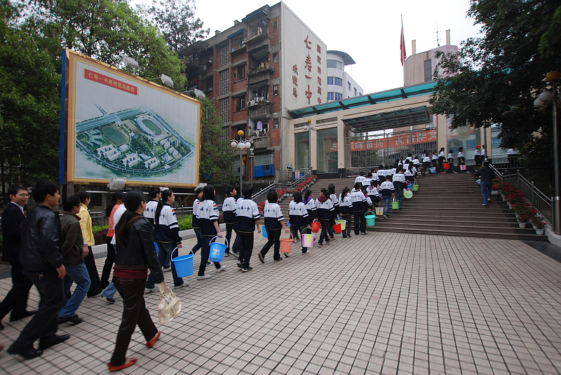 参加本次活动的同学与老师手提水桶、肩扛锄头来到了飞泉山,教师和同学三五一组,有的挖土,有的放苗,有的施肥,有的浇水,有的填土,一起共同合作种植小树。种下的一棵棵树苗,不仅美化了我们的家乡仁寿,更美化了我们的心灵。
