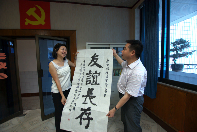 学校校长方良元代表仁寿一中热情欢迎客人的到来,并向来宾介绍了本校的办学情况及发展特色和方向。代表团一行饶有兴致地参观了学校新校区校园、高初中部校园和校史陈列室,不时地发出赞叹声,并对我校优美的校园环境和富有特色的教育教学管理表示欣赏。通过双方的交流了解和诚意,两校校长签定了《中新学校合作交流备忘录》,旨在培养学生国际视野和学生的文化适应性,加强中新两国学校之间的相互了解,推进两校在教育教学方面的友好交流。