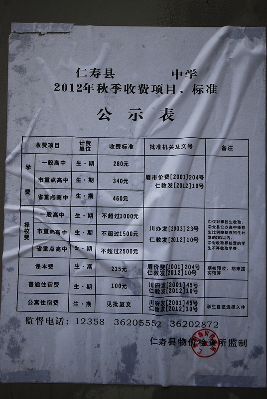 仁寿一中北校区2012年秋季收费项目、标准公示