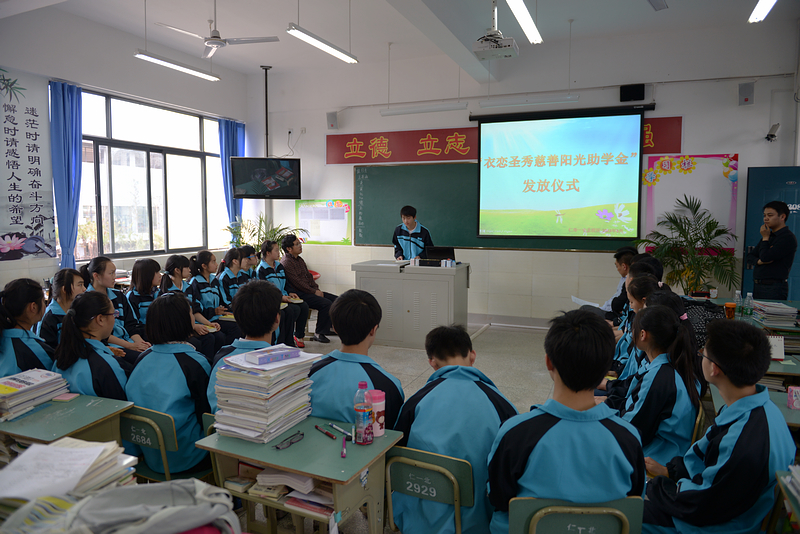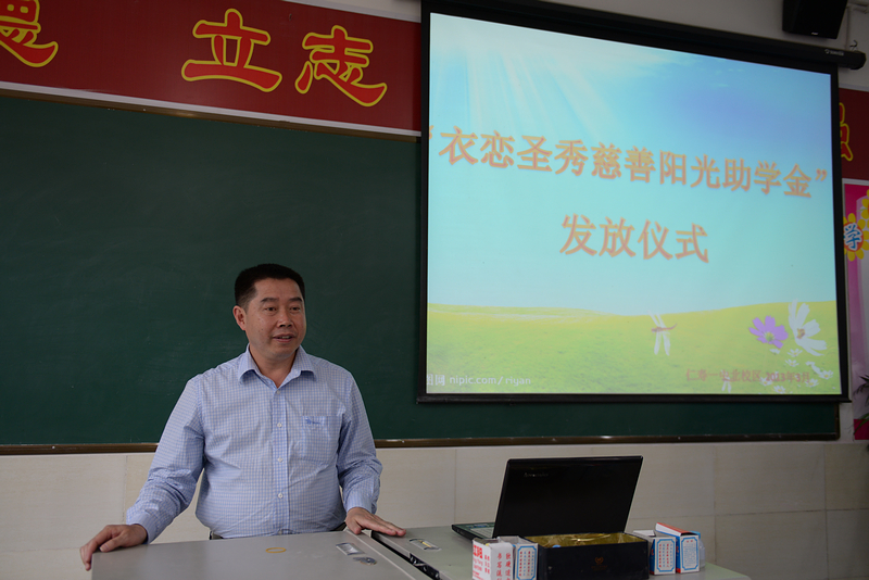 3月27日下午,2013年“衣恋 圣秀慈善阳光助学金”发放仪式在我校“衣恋 慈善阳光班”举行。25名“慈善阳光班”的同学喜获本届衣恋助学金。出席颁奖仪式的有:仁寿一中校长方良元、副校长叶志强、政教处主任何建文,“慈善阳光班”班主任言云光等。颁奖仪式由学生干部主持。