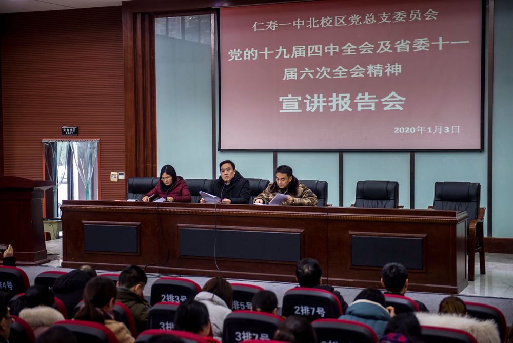 2020年1月3日下午,仁寿一中北校区举行十九届四中全会及省委十一届六次会议精神宣讲报告会。报告会由学校负责人高世金主讲,全体教职员工参会。