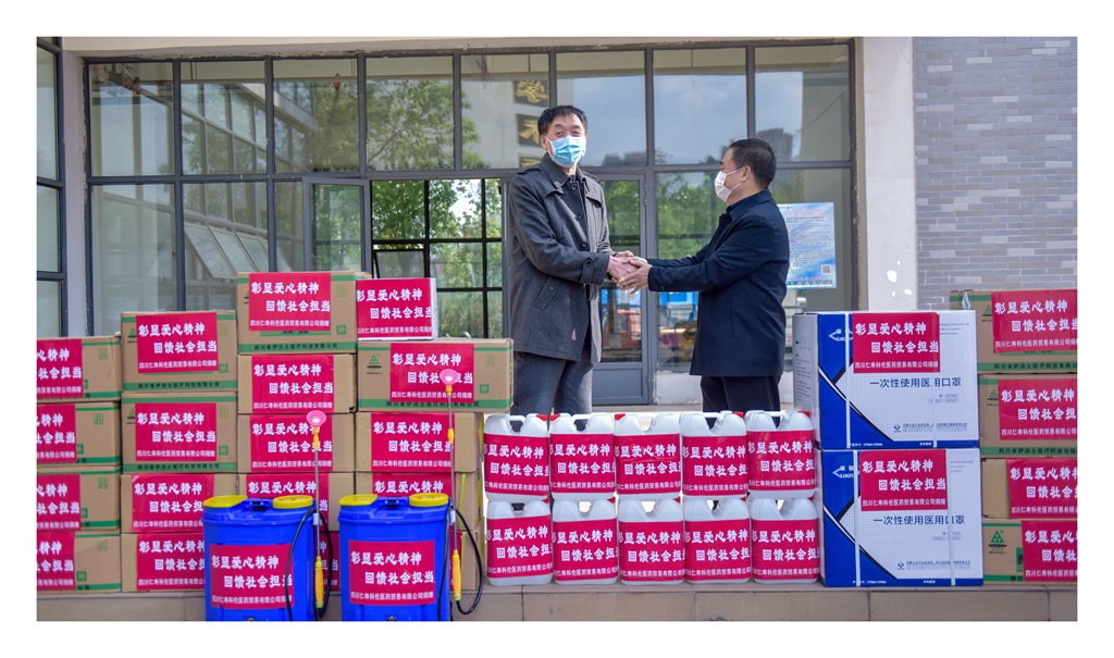捐赠仪式现场,仁寿科伦医药贸易有限公司向学校捐赠了3600个口罩,2套隔离服、50双手套护目镜、240瓶免洗手液、600瓶酒精喷雾消毒液、200瓶84消毒液、10桶75%酒精、2台电动背负式喷雾器。