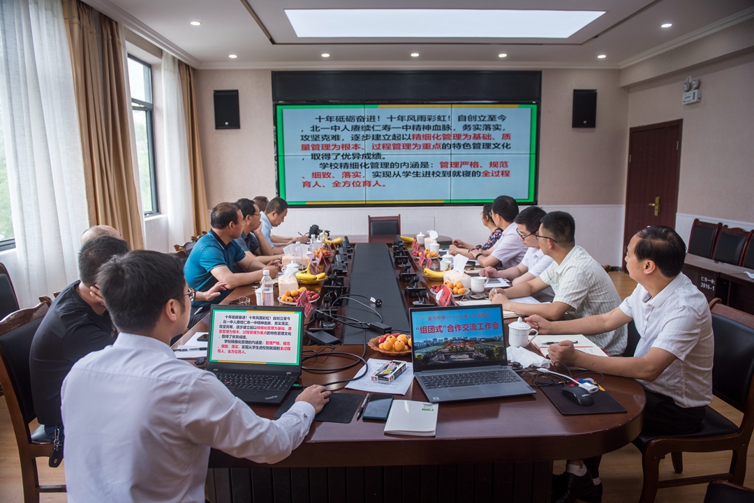 仁寿一中北校区与金川中学双方领导在行政楼会议室进行了倾心座谈。韩兴鸿校长首先真挚诚恳地表达了对仁寿教体局和一中北校区的谢意,接着介绍了金川中学的主要情况:学校现有初高中学生共1200人,教师142人,学校教学设施先进,但师资力量有待加强,希望两校深化人才交流,形成精准对接、深度合作的长效机制。