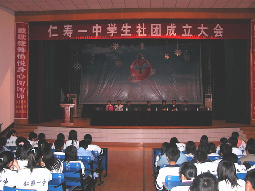 仁寿一中团委、学生会于3月27日在仁寿一中演播大厅召开了仁寿一中学生社团成立大会,大会由政教处副主任张波同志主持,大会宣布成立了校级学生社团11 个,并为社团聘请了11位素质高、业务精的指导老师。学生会负责人陈权老师宣读了《仁寿一中学生社会》管理条例,指导教师代表何亭上台发言,演讲社但秋红同学代表学生社员发了言。仁寿一中校长方良元到会祝贺并发表了重要讲话。