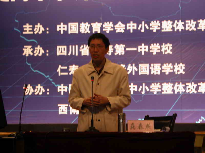 9:30——11:30,重庆市教科院研究员、特级教师、西南大学教育学院教授龚春燕又为与会代表作了一场引人深思的报告——《课堂生命:适应与创新》。龚老师在报告中一再强调“创新”,提倡素质教育。他认为,实行素质教育,必须牢记“一二三”。“一”即一个宗旨:以学生为本,促进人的发展;“二”即两个重点:创新精神与实践能力;“三”即三个发展:全面发展、全体发展、个体发展。听完龚老师的报告,代表们感触颇多。他们说,这场报告很生动,很实在,对我们的课堂教学具有很大的指导作用。