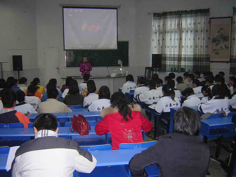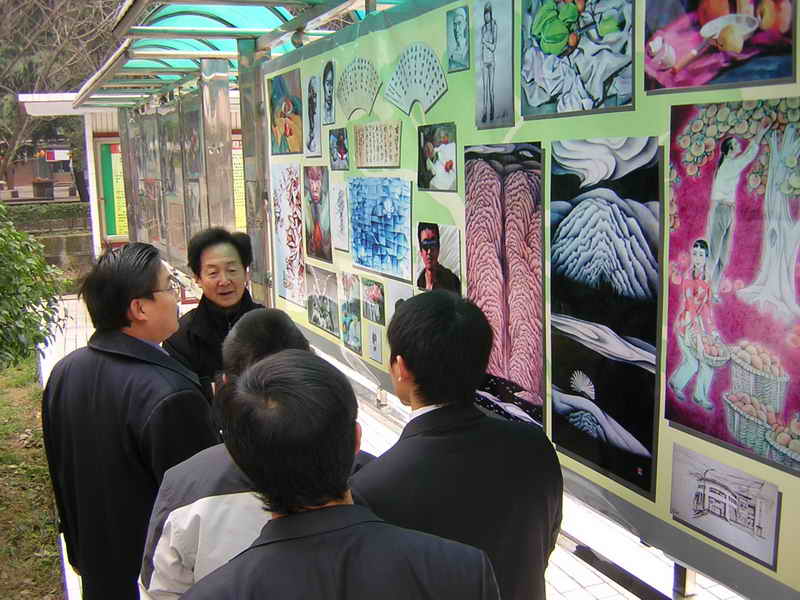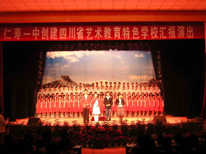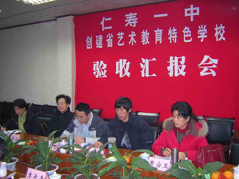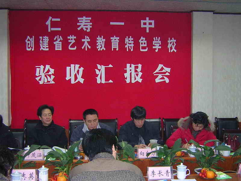 专家组首先听取了方校长“以提高艺术教育,提高学生的人文素质”为题的汇报。而后通过“查资料--听课--访问学生--看演出--看学生社团活动”等方式,对仁寿一中艺术教育进行了全面检查。在下午的意见交换中,叶茂涵老师谈到了三点:1、仁寿一中的领导 重视艺术教育,关注艺术教育,给学生的艺术水平发展搭建了很好的平台。仁寿一中的艺术设施好,有专门修建的艺术楼,功能室等。2、仁寿一中环境优美,雕塑广场、卸思圆、师生作品陈列给人以美的启示,真正达到了让每一块墙壁说话,起到了环境育人的目的。3、美术课的课题教学很活跃,青年教师成长很快,教师有独到的思想和见解,课堂教学很新颖。叶老师还提出了一些改进意见:即艺术长廊还应再长一些,对美术特长生的培养还应注意分层次教学。曹安玉老师也对仁寿一中的艺术教育给予了很高的评价,同时提出了宝贵的意见。最后,张志刚副处长宣布:仁寿一中顺利通过“四川省艺术教育特色学校”的检查验收。