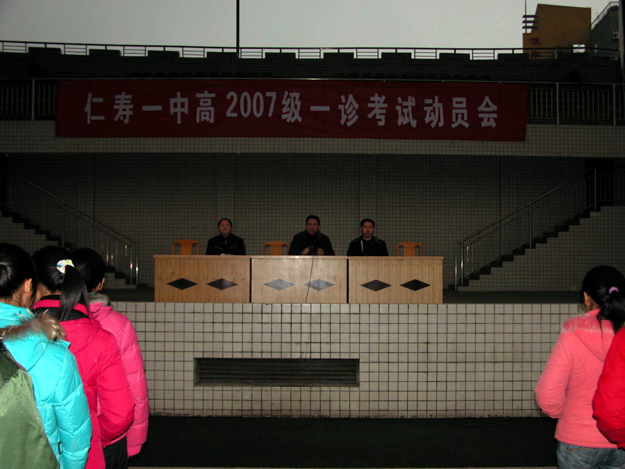 仁寿一中全体高三学生冒着寒风细雨认真听取了学校领导的发言。