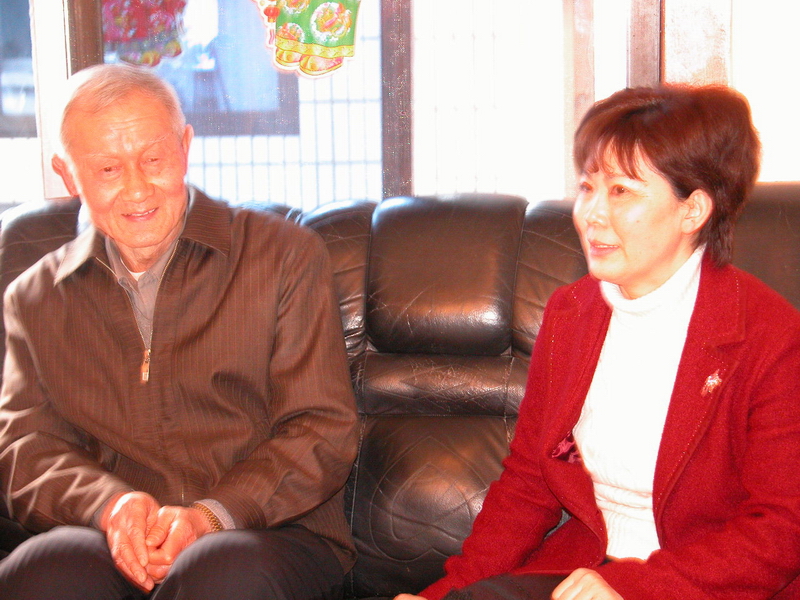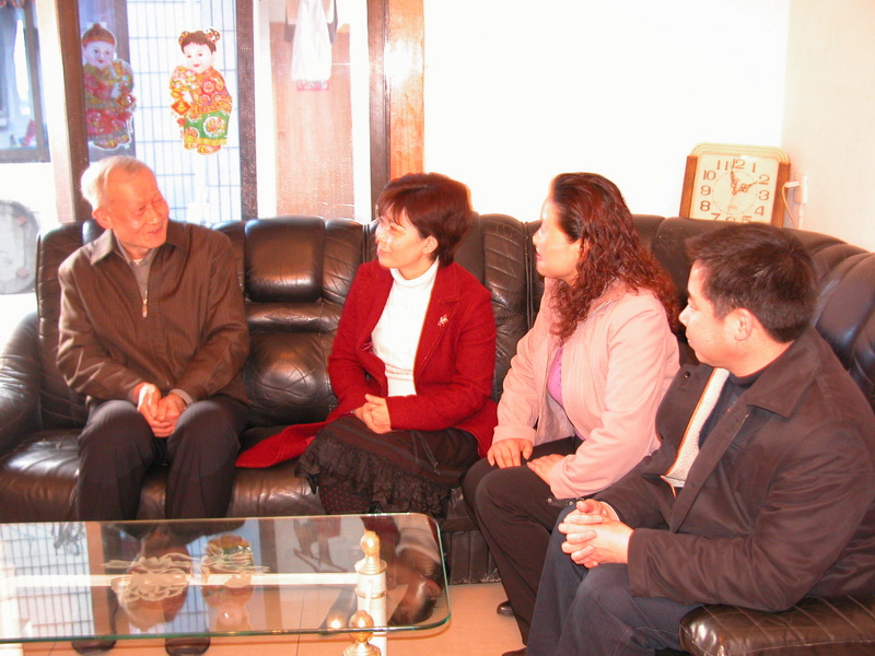 眉山市副市长杨玉仙同老校长余子勤亲切交谈;方良元校长、辜学良局长陪同慰问。