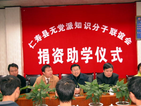 3月6日上午,在仁寿一中会议室举行了仁寿县无党派知识分子联谊会捐资助学仪式。由仁寿县统战部倡议、组织的,来自仁寿县各单位、各阶层的无党派知名知识分子代表,以及受助学生,学校有关行政领导等参加了本次捐资助学仪式。仪式在和谐温馨的气氛中进行,无党派知识分子代表们以自由发言的形式,谈了本次捐资助学活动的目的及希望;方校长代表学校谈了我校解决贫困学生所做的几项措施,希望也感谢各届人事对学校贫困学生的关注和资助。受助学生学生人人发言,谈了自己的家境及学习情况,感谢叔叔阿姨们的爱心资助,一定加倍努力学习、成材,回报大家,回报社会。