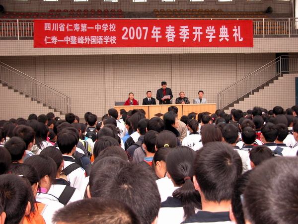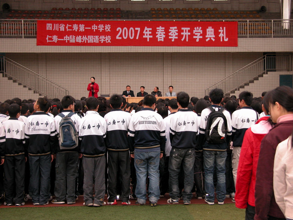3月6日上午,在仁寿一中体育场举行了,2007仁寿一中、仁寿鳌峰外国语实验学校春季开学典礼。两校全体七千余名师生参加了大会。大会在庄严的国歌声中开始,全体师生以饱满的热情,精神抖擞迎接这新学期的到来。方良元校长做了新年祝词。回顾了过去的一年我们取得的成绩,明确了我们在新的一年里奋斗的目标。接下来是教师代表、学生代表上台讲话,他们号召、鼓励师生们,在新的一年里,把握好新的方向,以新的面貌,新的气象,创造出更新的天地。