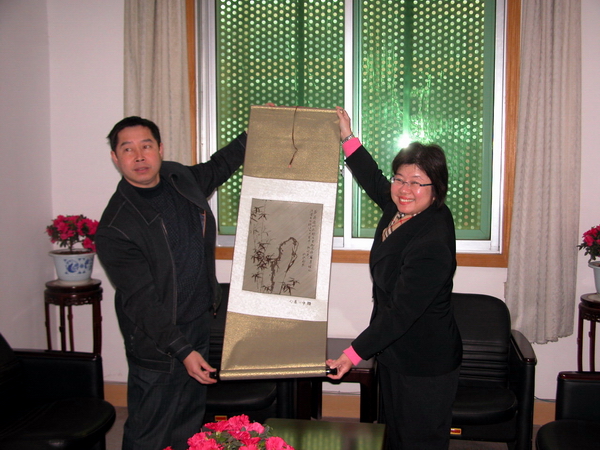 方良元校长向新加坡大迈中学赠送礼品 余俊文先生与我校总务主任文曼林交谈
