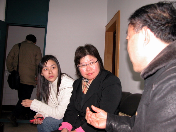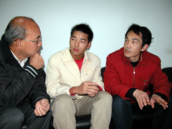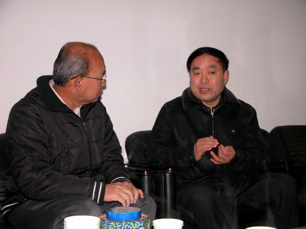 余俊文先生与我校政教主任向双全交谈 林汶琏女士与我校总务主任文曼林交谈