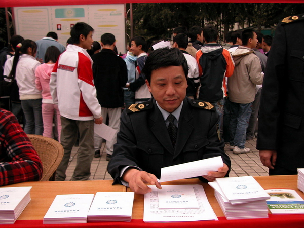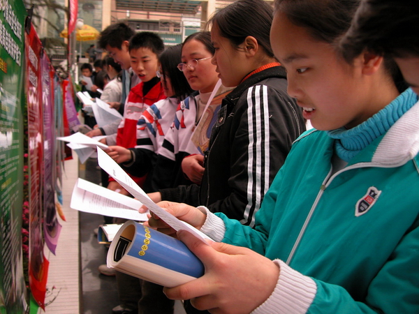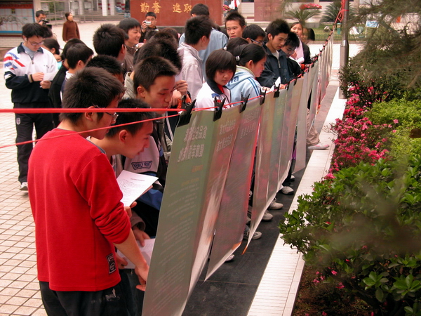 学生观看宣传图片 仁寿一中学生答记者问