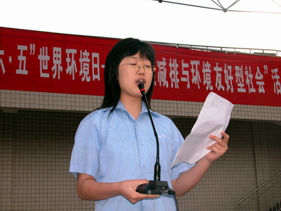 钟万霖同学作了积极参加“六·五”主题活动的演讲。会后,各班切实按照学校主题活动日程安排,认真召开了主题班会,办好了主题黑板报。各研究性学习小组在指导老师的指导下,选好了活动项目,着手开展社会实践及征文活动。