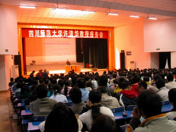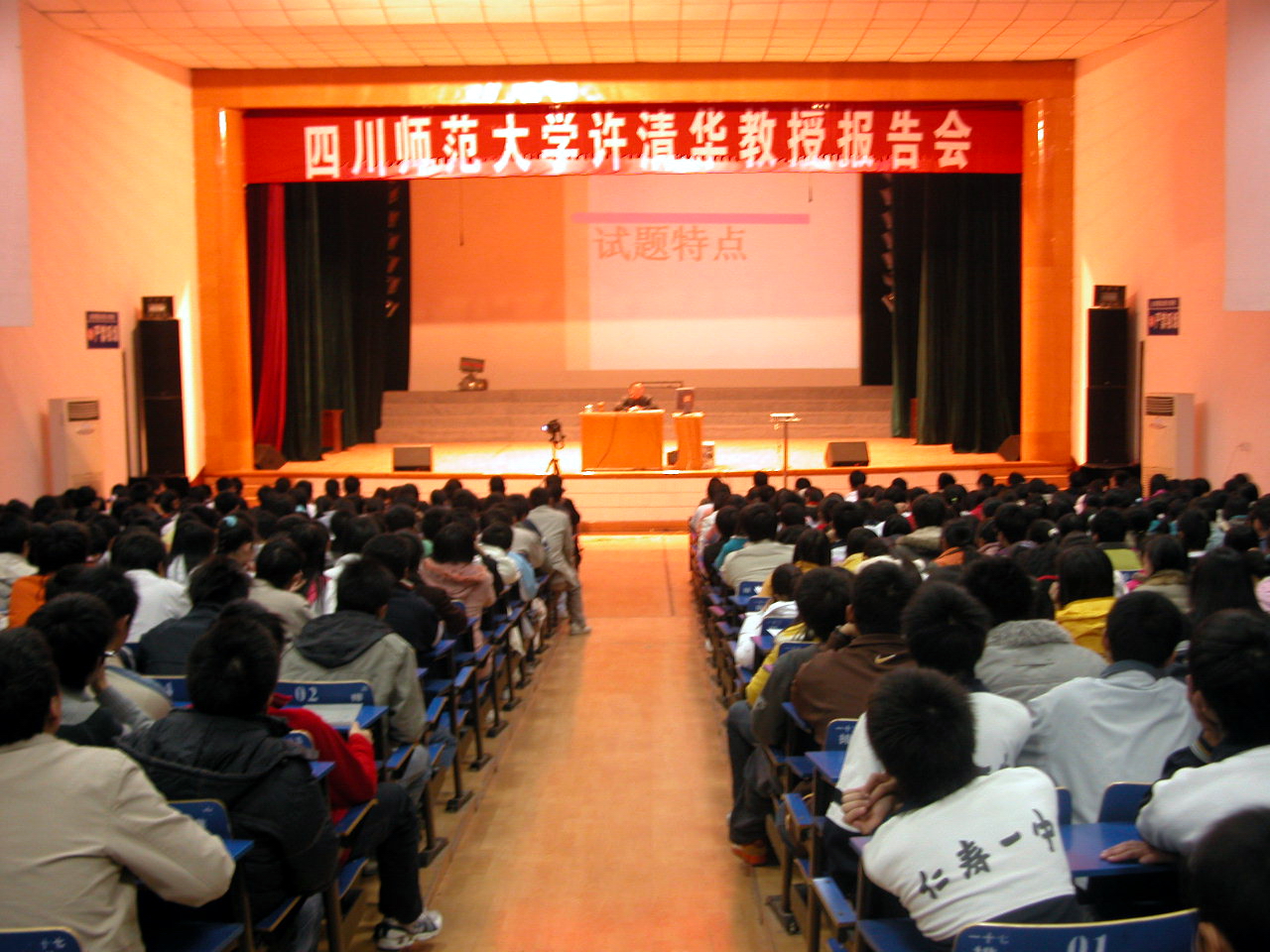 许清华教授纵观四川2年自主命题以来,四川省高考数学试题的特点,对四川数学高考作了权威评析。他准确细致的评述让在场的师生受益匪浅。获得了全场热烈的掌声。
