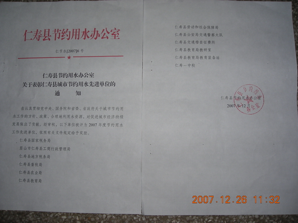 近日,仁寿县节水办公室发出《关于表彰仁寿县城市节约用水先进单位的通知》”,表彰了12个先进单位,我校榜上有名。
