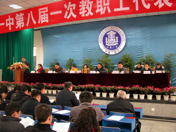 仁寿一中校长方良元以“提升质量、科学发展,以优异成绩喜迎建校245周年。”为题作了八届一次教代会报告。方校长以“政治是灵魂,荣誉是精神”、“质量是生命,效益是我们追求的高目标”、“坚持素质教育,全方位地培养学生的个性特长”、“和谐环境,安全是第一要素”等四个方面对过去的2007作了全面的又突出特性的总结回顾。展望2008是全面贯彻落实党的十七大重要决策的第一年,是强力推进许多重大改革举措的一年。也是我国首次承办奥运会的大喜年。抓住时机团结拼搏共谋发展。从明确指导思想、到找准目标、完成十项重点工作、和抓好日常工作等四个方面提出了行动目标和希望。总之,做到科学管理;推进激励、约束机制;加强师德师风建设、加大师资培养力度。