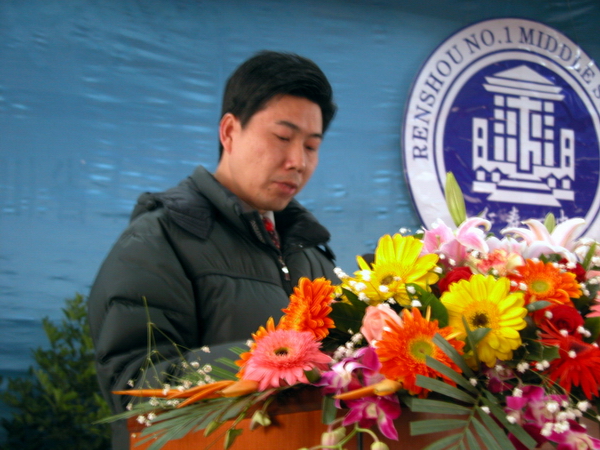 教师代表胡松剑在宣读倡议书 大会在嘹亮的国歌声中毕幕
