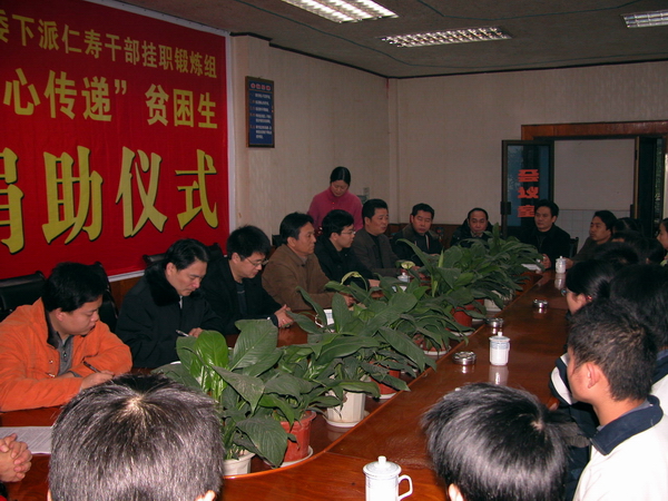 2008年1月10日上午,在仁寿一中行政会议室的会议桌上放着一份协议,需要签订的甲方是中纪委下派仁寿锻炼干部代表吴振亭、赵锋、张少华,而乙方是八名仁寿一中学生和两名仁寿中学的学生,他们都是成绩优秀家庭贫困的高三学生。此次中纪委下派仁寿锻炼的干部本着奉献爱心的目的,筹资1.8万元,组织实施了这项“爱心传递”计划,捐助贫困生。意在撒下爱的火种,让爱向2008奥运火炬一样传递下去,让爱不断延续,被资助的学生,需要签个协议,不要忘记社会给我们的爱,在自己以后具备能力的条件下,同样资助贫困学生,使爱心永远传递下去。协议只是个承诺,更多的是希望是让大家拥有爱心,拥有一份责任,拥有回报社会之心。