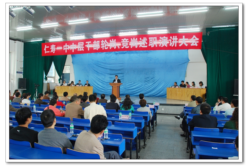 根据上级指示及文件精神,从今年开始对学校中层干部施行轮岗、竞岗改革制度,仁寿一中作为仁寿教育改革的一面旗帜,率先实施了对中层干部的任免改革试点任务,今天到会的除二十一位参加竞岗、轮岗的干部外,还有由教育局相关领导、仁寿一中校级领导、教师代表等 十人组成专家组评委,六十名教职工代表组成大众评委。根据一定的规则进行打分、评分、计分。另外到会的还有教育局相关领导、兄弟学校领导等到场观摩学习。