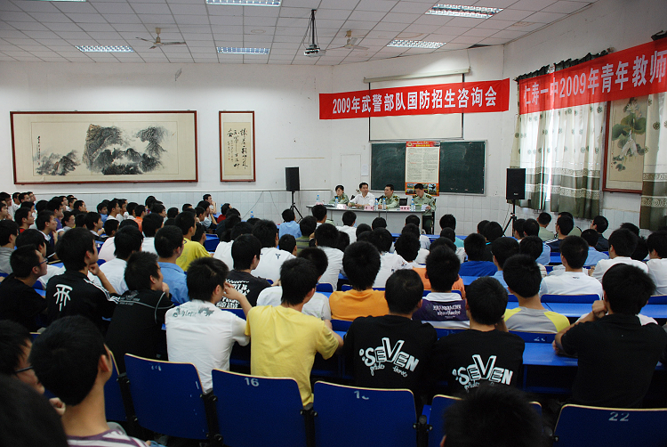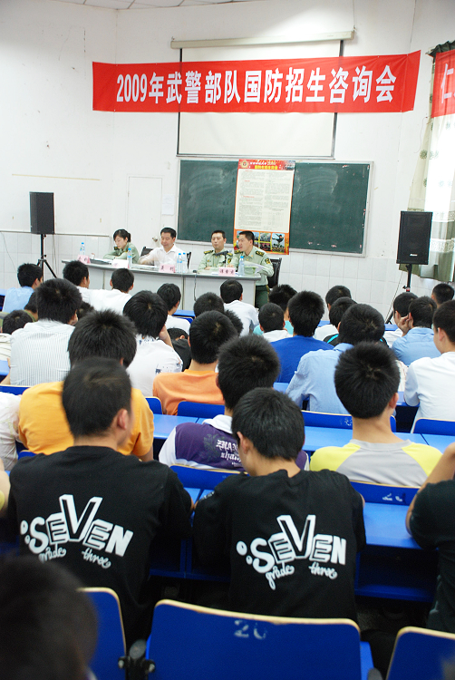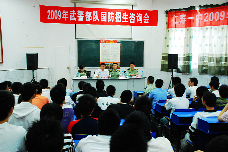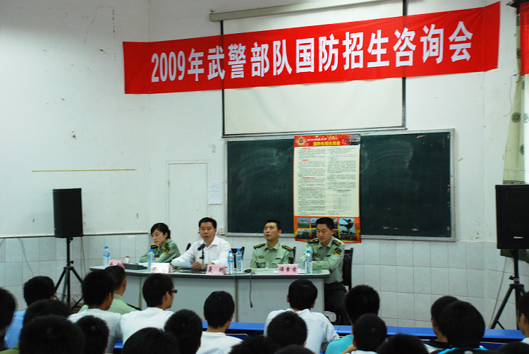 军校和国防生招生近年来成了考生和家长关注的热点、焦点,高考在即,仁寿一中作为成都军区国防生源基地,为了让广大考生和家长对今年的军校和国防生招生政策有更明确的了解,于4月24日下午,在仁寿一中阶梯教室特邀了武警部队驻西南财经大学选拔培养办的聂明上校等领导到场就2009年国防生招生情况,以及考生和家长普遍关注的一些问题作解答。